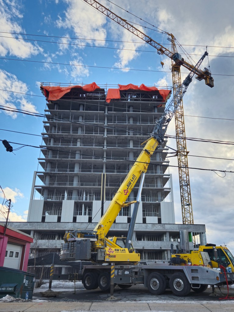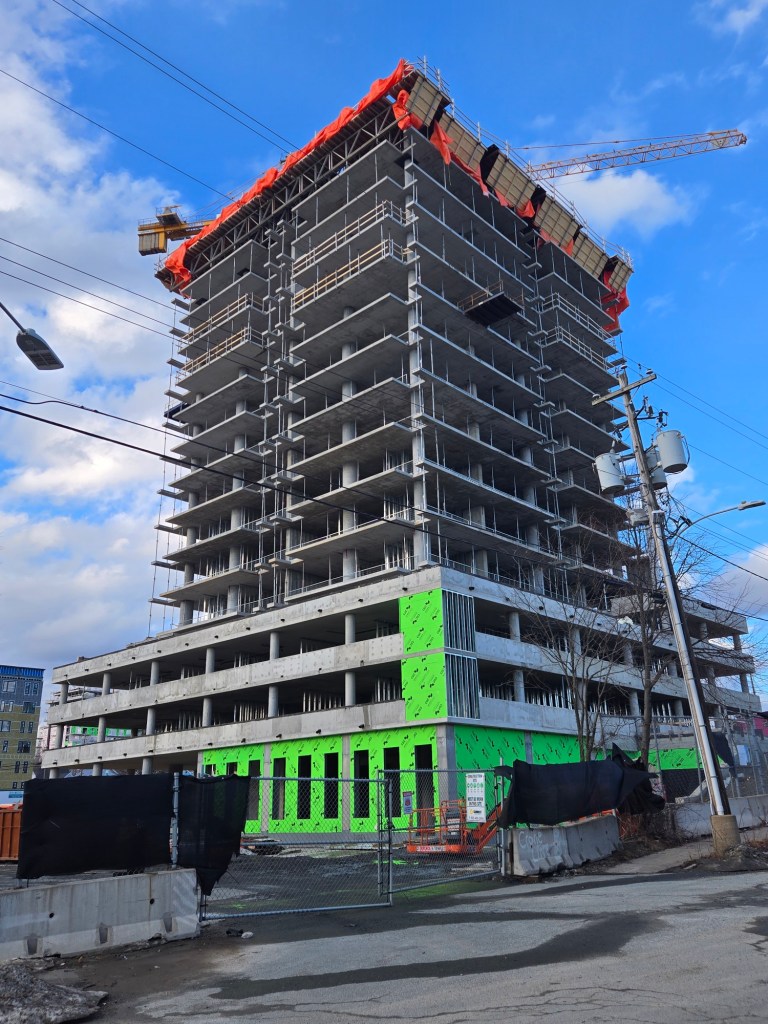 Cladding is going up on the tower’s east wall. Framing is underway along Williams Street.